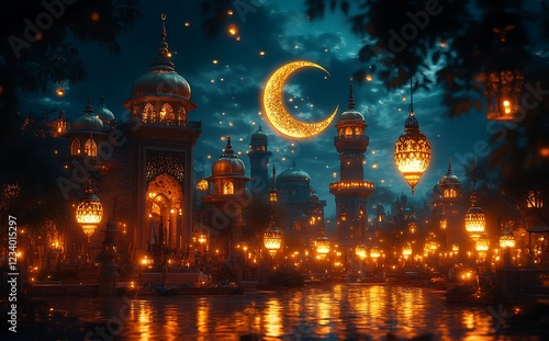 Fantasy night scene with illuminated buildings, lanterns in the sky, and a crescent moon over water during Ramadan