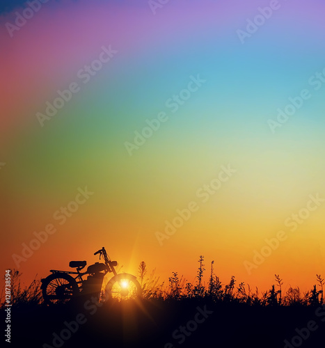 Fantasy picture bright colorful sky and silhouette of an old motorcycle in a simple evening twilight at sunset.
