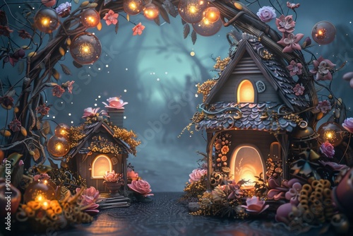 Fantasy Pixie Hollow Frame. A frame of delicate flowers, glowing orbs, and tiny, whimsical houses.