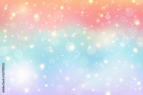 Fantasy watercolor illustration with rainbow pastel sky with stars. Abstract unicorn cosmic backdrop. Cartoon girlie vector illustration.
