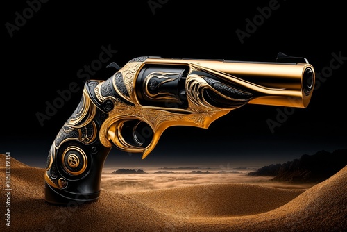 Fantasy-inspired gun with intricate engravings and mystical symbols, set against a magical landscape capturing the unique, enchanted design of a mythical firearm, symbolizing mystery and power