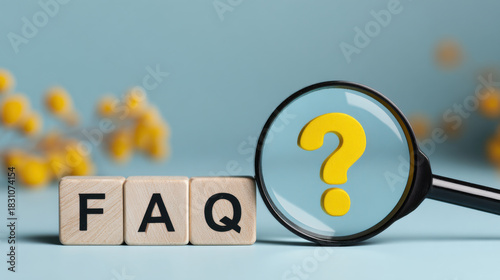 FAQ concept with question mark and magnifying glass on a blue background