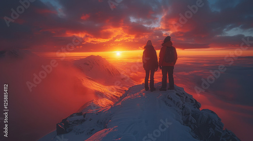 Far photography of two people hiking, and standing on the snowy mountain top, looking at beautiful horizon view of a sunrise, under the cloudy sky.