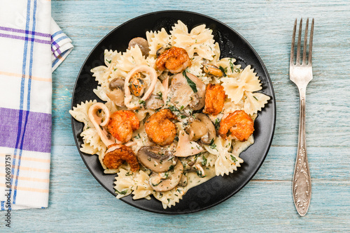 Farfalle with cream sauce with calamari and mushrooms and fried shrimps in a black plate - traditional Italian pasta with seafood and mushrooms, close-up