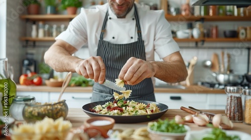 Farfalle with Sun-Dried Tomatoes and arugula in Bright kitchen counter, Pasta photography