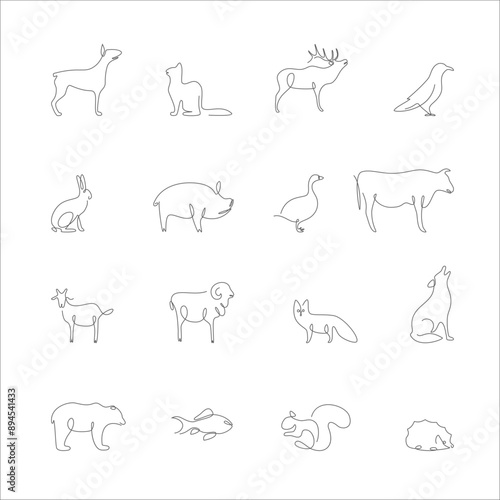 Farm and Forest Animals One Continuous Line Drawing Sign Emblem Icon Set Include of Sheep, Rabbit and Cow. Vector illustration of Simple Linear Style