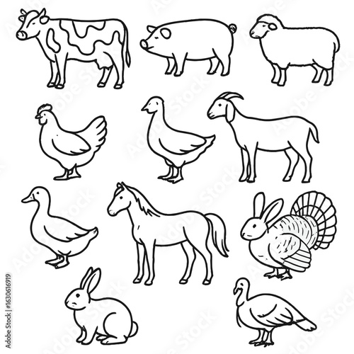 Farm Animal Icons. Outline style icons of Farm Animal Breeds: Holstein cow, Berkshire pig, Merino sheep, Rhode Island Red chicken,