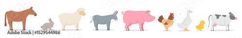 Farm animal vector set. Cartoon goat, cow, pig, horse, chicken, and duck. Cute barnyard illustration isolated on white. Rural domestic livestock icon for countryside design.