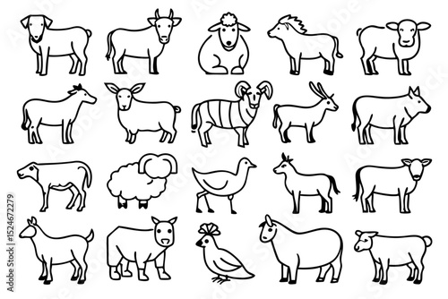 Farm animals illustration featuring pork hen cow sheep goat and goose isolated on transparent background