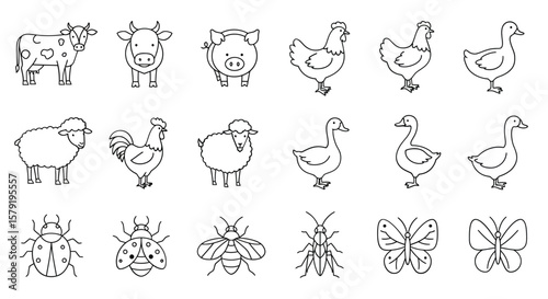 Farm Animals Insects Butterflies Simple Line Drawings Illustrations Designs Pictures Graphics
