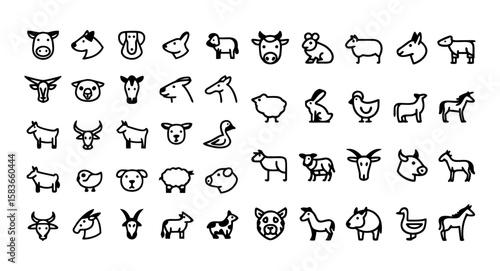 Farm Animals Line Icon Set – Thin Linear Vector Pictograms of Cow, Bull, Sheep, Lamb, Goat, Horse, Pig, and Common Domestic Livestock