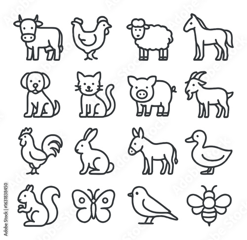 Farm animals linear icon set. containing cow, chicken, sheep, horse, dog, cat, pig, goat, and more.