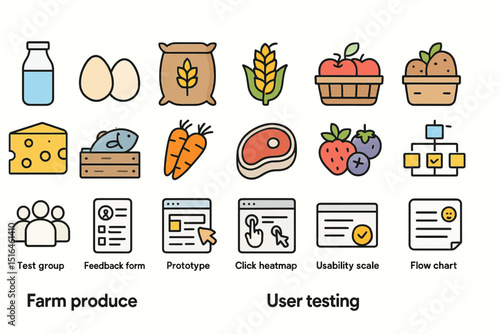 Farm produce and user testing icons: agriculture and digital development illustrated
