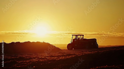 Farm Tractor Silhouette Against Golden Sunset on Agricultural Field