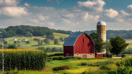 Farm with Red Barn and Silo Surrounded by Lush Farmland