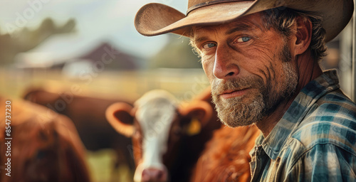 Farmer examining beef cattle feed trough outdoors, thoughtful expression, diverse cattle herd, rustic farm setting, natural daylight, warm colors. Generative AI.