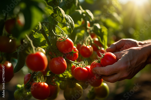 farmer hands harvesting tomatoes in tomato farm bokeh style background