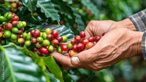 Farmer harvesting arabica and robusta coffee berries in a lush agricultural field