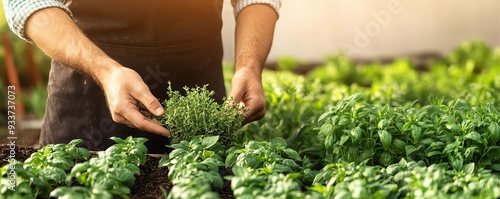 Farmer harvesting fresh organic herbs from a sunlit garden, farm-to-table herbs, natural flavor boost