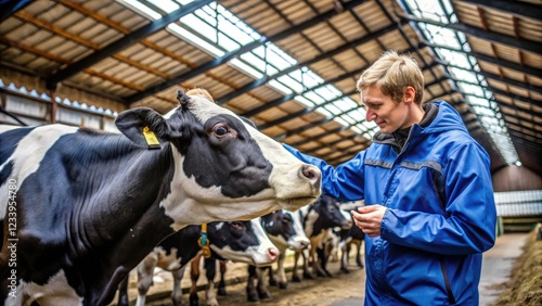 Farmer holding head of cow in a barn, emphasizing the human-animal bond and livestock farming practices in an agricultural setting.