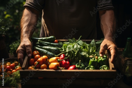 farmer holding with his hands a basket of organic vegetable products