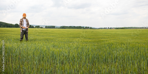 farmer inspect field. banner with copy space.