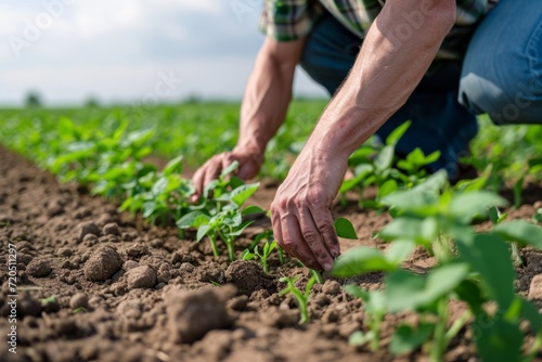 Farmer Inspecting Soybean Seedlings In The Field, Representing Agriculture And Growth