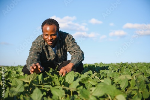 Farmer is standing in his growing soybean field. He is examining progress of plants
