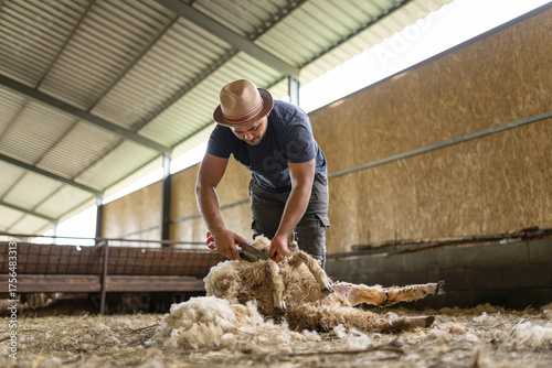 Farmer shearing sheep for wool in barn