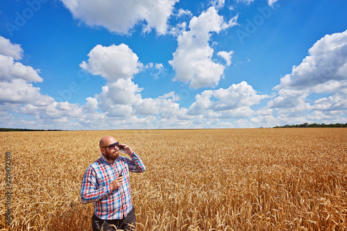 farmer smokes electronic cigarette and call in a ripe field of wheat with blue sky