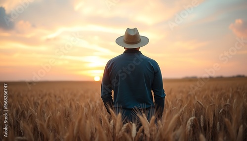 Farmer standing in golden wheat field at sunset golden hour agriculture