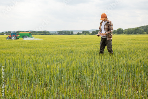 Farmer to use check list for check quality of agricultural work and tractor spraying pesticides on a wheat field.