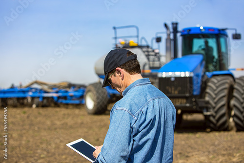 Farmer using a tablet while standing on a farm field and a tractor and equipment seeds the field; Alberta, Canada