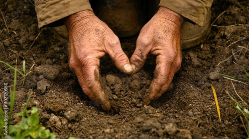 Farmer’s hands cupping soil in a rural field, symbolizing a connection to nature and agriculture