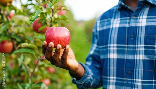 Farmer’s hand holding a ripe red apple, freshly picked fruit in natural orchard light