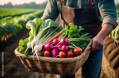 farmer's hands hold a large wicker basket with seasonal vegetables: radishes, greens, tomatoes on the background of the garden