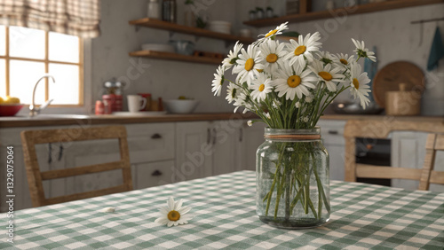 Farmhouse Kitchen Styling: Daisy Bouquet in Mason Jar on Checkered Tablecloth