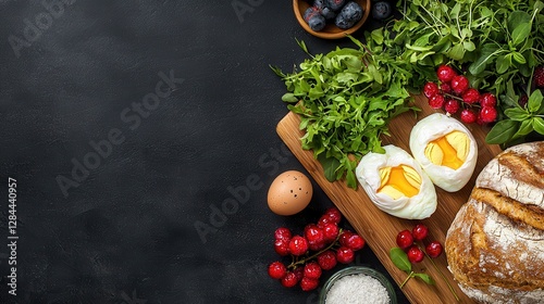 Farm-to-table cuisine ensures fresh quality. Fresh ingredients and eggs arranged on a dark background.