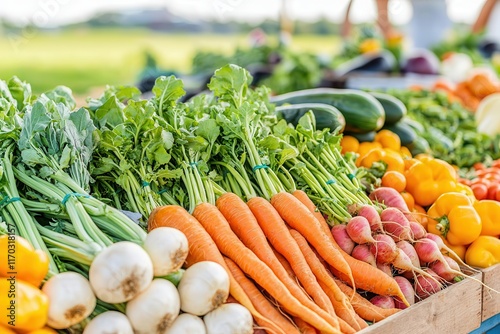 Farm-to-table promotes sustainability and healthy eating. Fresh vegetables displayed at a market stall on a sunny day.