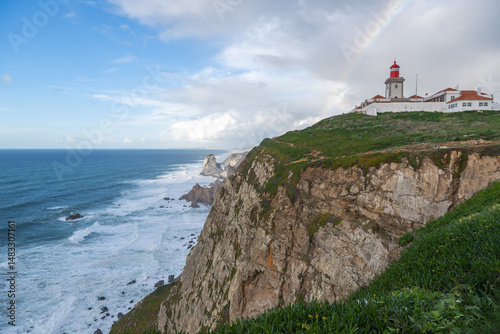 Farol do Cabo da Roca Coastal View Featuring a Lighthouse on a Cliff Overlooking Crashing Waves and Rugged Rocks During a Cloudy Afternoon in Portugal Coastal View