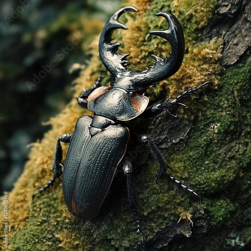 Fascinating close-up of a striking stag beetle perched on mossy bark in a lush forest environment