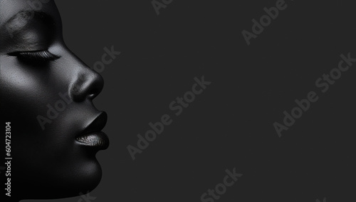 Fashion art. Beauty woman painted in black skin color body, gold makeup, lips, eyelids in gold color paint. Body art. Beauty gold metallic body, painted Skin. copy space, digital ai