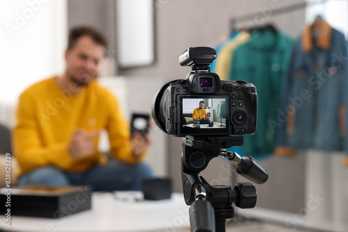 Fashion blogger showing wristwatch while recording video at home, focus on camera