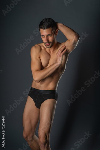 Fashion close-up portrait of a handsome male with bare torso posing in black underwear on isolated background