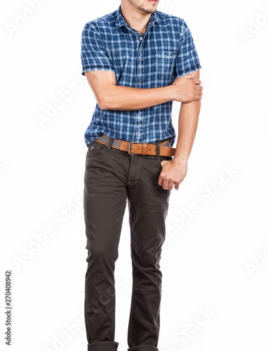 Fashion clothes, short sleeve shirt and pants men photo in white background