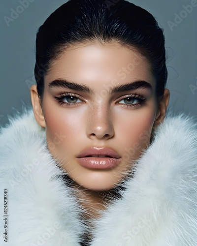 Fashion editorial portrait of European model in luxurious, modern outfit. Sexy elegant portrait of young beautiful woman in winter coat, generative AI