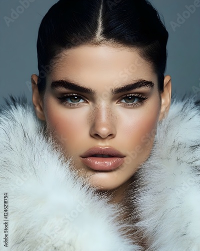 Fashion editorial portrait of European model in luxurious, modern outfit. Sexy elegant portrait of young beautiful woman, Young fashionable woman in winter coat, Close up of woman wearing fur jacket,