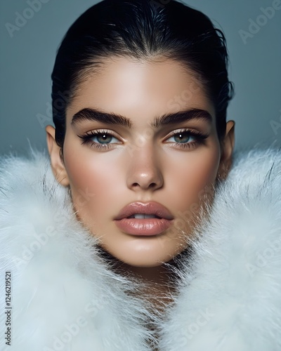 Fashion editorial portrait of European model in luxurious, modern outfit. Sexy elegant portrait of young beautiful woman, Young fashionable woman in winter coat, Close up of woman wearing fur jacket,