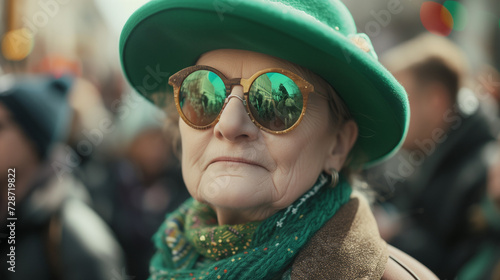 Fashion elderly lady in leprechaun clothes and a hat for St. Patrick's Day creates a festive ambiance on city street, with reflective stylish sunglasses.