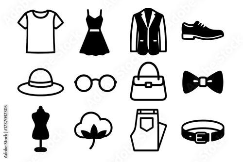 Fashion icon set vector. Garment and clothes symbols. Clothing and accessories line art collection. Apparel sign for web or app. T-shirt, dress, jacket, shoe, hat, glasses, bag.